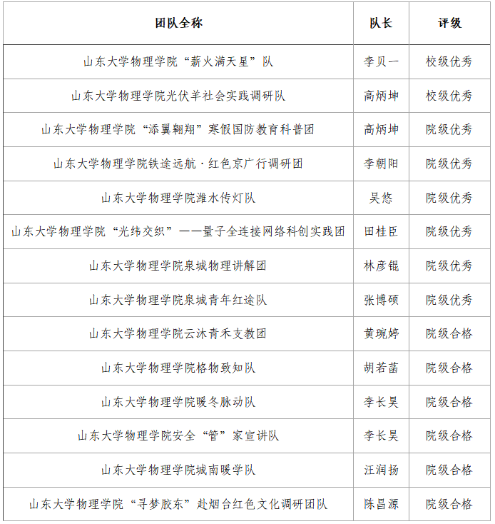 根据校团委《关于做好山东大学2025-2026学年学生寒假社会实践评比表彰与交流总结工作的通知》等文件的要求,物理学院团委开展了系列评比工作,现将评比与表彰结果公示如下:一、普通立项团队成绩与表彰二、社会实践优秀个人学院团委通过答辩及材料审核,确定社会实践优秀个人推荐结果如下:2023级:李程浩2024级:田桂臣 李朝阳 王宗凡 吴悠 徐彩馨 农子升 郭子剑 李昊宇 王泓烨2025级:杨正文 牛子豪 胡远航 张博硕 朴世轩 荆...