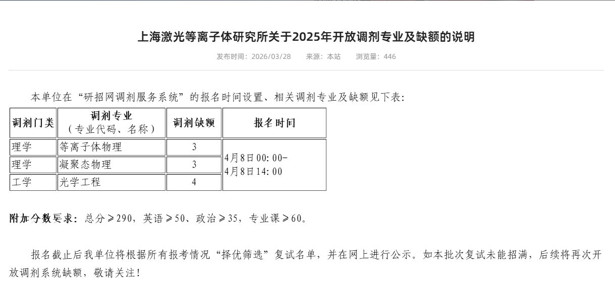 16.上海激光等离子体研究所关于2025年开放调剂专业及缺额的说明