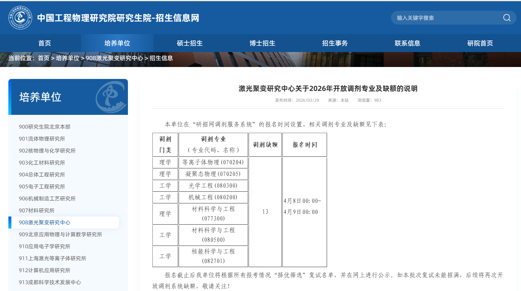 15.激光聚变研究中心关于2026年开放调剂专业及缺额的说明