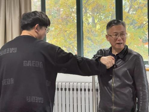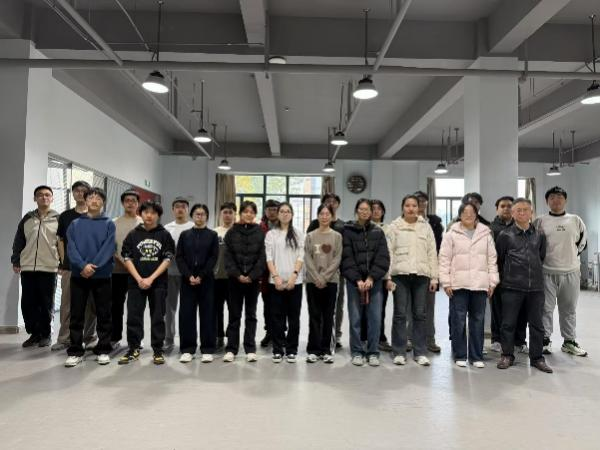 在实践教学环节,石教授带领同学们从桩步五势入手,细致讲解“外三合”与“内三合”的动作要领与心法内涵。随后的擒拿对练更是将现场氛围推向高潮,同学们在石教授与协会成员的指导下,两人一组体验“喂拳”训练,感受力量控制与身体反应之间的微妙关联。拳法架式转换中的动静平衡、擒拿技巧中的力道控制,无不体现着力学原理与身体智慧的生动结合。2025级硕士研究生李梦瑶在体验后表示:“在擒拿对练中,我真切感受到了力学原理的生动运用。这种将课堂知识融入身体实践的体验,让我感受到身心合一的专注与掌控。” 2024级本科生王宗凡分享道:“梅花拳讲究‘内三合’,要求心与意合、意与气合,这种专注状态的培养对我们从事学习和科研工作大有裨益。在实验中同样需要身心协调,保持冷静与专注。”