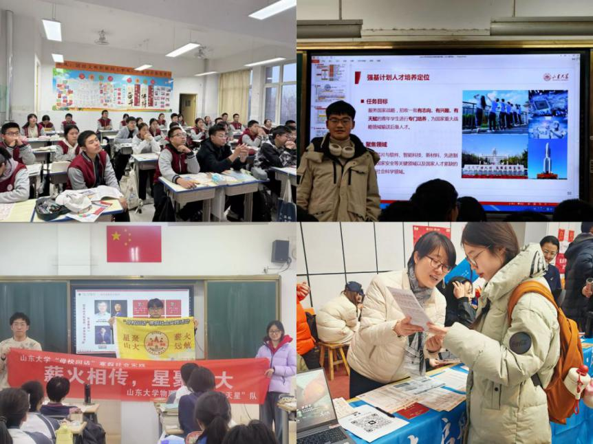 为积极传播山大声音,学院组建11支宣讲队伍,深入山东、河南、内蒙古等地重点中学,架起山大学子与各地高中生的沟通桥梁,累计覆盖高中生2500余人次。在河南新郑,“河南新郑实践团”连续走访3所高中,学子们结合自身经历,为高三学子分享备考方法与志愿填报技巧;在山东潍坊,“薪火满天星”队开展升学需求问卷调查,以数据解析需求、提供针对性答疑,并发放文创产品,传递“星聚山大,薪火远航”理念。